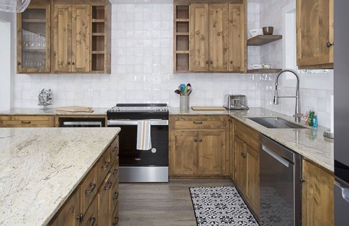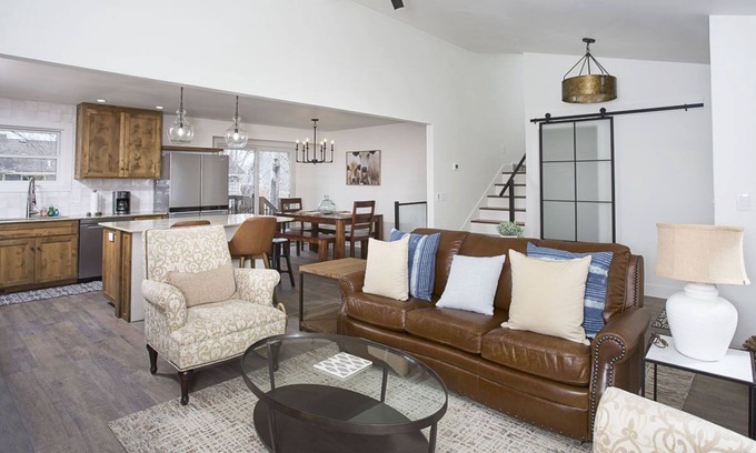 The interior is Great for families, offering a large open concept kitchen, living room and dining room. Everything is New!! The kitchen has wood, stainless steel, ceramic and granite finishes. The living room has a huge 65 inch smart TV with plenty of very comfy seating and vaulted ceilings. The dining area has a large table that can accommodate at least 6 with island seating of at least 4.