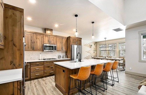 Your stay at West Mountain Memories is enhanced by an array of amenities designed for comfort and entertainment. The spacious, well-appointed cabin features four bedrooms, including master and junior suites, alongside three and a half baths to accommodate your wedding party and guests comfortably. Gather in the gourmet kitchen or unwind in the open great room, which flows seamlessly into a 45-foot-wide Timbertech deck perfect for outdoor dining. After the festivities, rejuvenate in the private hot tub under the trees or gather around the outdoor fire pit for storytelling and laughter, making every moment spent here memorable.