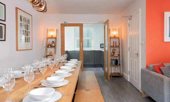 Spread over three floors, this contemporary city pad offers a blend of urban sophistication and comfort. The open-plan living and dining area is perfect for socialising, while the sleek kitchen is fully equipped for group meals. The stylish décor includes handcrafted lighting, an artisan dining table, and memory foam mattresses for a restful stay.