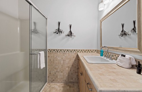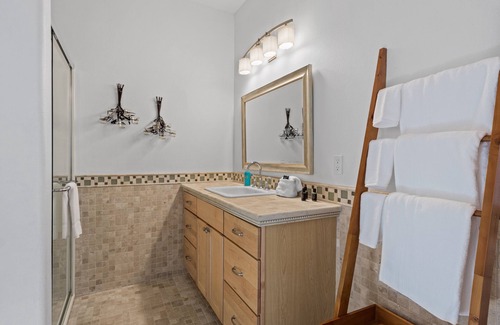 Master suite: There is a spacious bedroom with a comfortable queen size bed and a small smart TV. The bathroom with a spacious walk-in shower. For those who like to sleep in the main windows have blackout shades. There is also a walk-in- closet with a washer and dryer tucked away for your convenience.