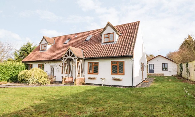 This charming detached cottage rests in West Wickham, near Linton, in Cambridgeshire and can sleep 14 people in six bedrooms.