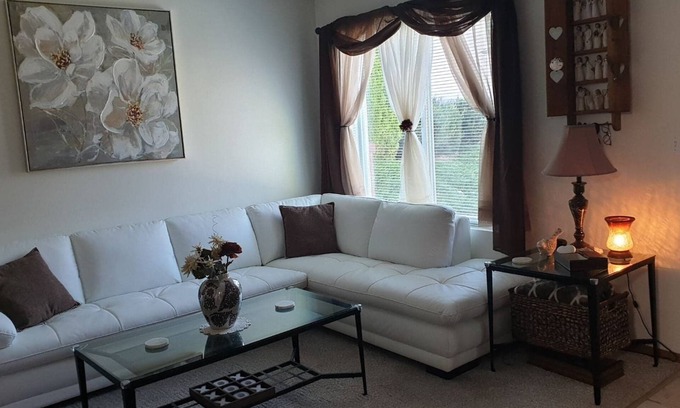 The living room is furnished with a white leather sectional and accent chair for encouraged relaxation and piano. You can also watch movies on a smart TV with Blu-ray player, Netflix or stream your favorite movies via our free Wi-Fi, now it’s time to relax and enjoy. The dining room is open to the kitchen area with a secretary desk. The kitchen is fully stocked with spices/herbs, cookware and dinnerware everything you may need is provided. Just grab your groceries and you’re set to prepare your favorite home cooked meals. There is a laundry facility in the unit and we supply basic laundering supplies.