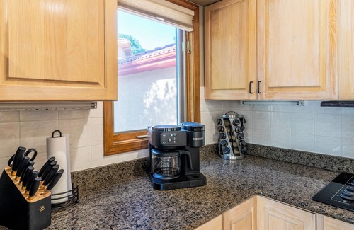 This Spanish-style home with 17' ceilings and relax on the oversized leather sectional and enjoy shows or movies on massive 85-inch 4K smart TV. Enjoy a fully equipped kitchen with double ovens, range, and refrigerator. The perfect space to cook with ease.