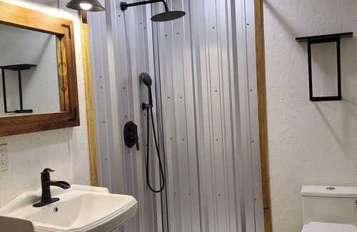 This adorable cabin offers a cozy retreat for guests as well as great venue setting. Many of the features have been created from the pine wood that was removed on the property and you will see it all throughout the cabin, including the beds. This cabin includes a living room with a 55inch Roku TV and a 40 inch Roku TV in the master bedroom. A full king size bed and the cabin also boasts a well-equipped clawfoot bathtub, a shower, heating, cooking equipment, WiFi, and AC for a comfortable stay. This is a brand new development, so join us and be one of the first to explore!