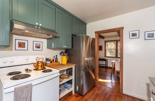 Step inside this inviting 2 bedroom/ 1 bath home, where comfort and style seamlessly blend. Two well-appointed bedrooms each with Queen beds provide a restful stay while a versatile den offers additional space for relaxation or playing games. The shared bathroom offers a shower. The living and dining areas are open and airy , perfect for gathering with loved ones. The fully equipped kitchen boasts all the modern amenities needed to create delicious meals. Please note there is no dishwasher but the kitchen is very well stocked with dishware! Guests will love gathering around the crackling warmth of the cozy wood-burning stove, which is the main heat source or venturing outside to the enchanting fire pit to share stories under the starlit sky. A dedicated laundry room, complete with a washer and dryer, adds to your convenience, while enhanced speed Wi-Fi ensures seamless connectivity throughout the house. No garage but ample onsite parking for up to 3 vehicles.