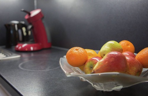 Layout: Ground floor: (hallway(toilet), Living room(fireplace, stereo unit), Kitchen(coffee machine, microwave, dishwasher))