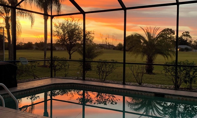 Paradise! Relax in this spacious 3-bedroom home conveniently located in Lehigh Acres, Ft. Myers area. This inviting home is perfect for a tranquil getaway that features a private pool with a lanai. Featuring 1 king bed, 2 queen beds, den, extra bonus family room 2nd floor with a queen bed chest. Make your vacation one for the books with a stay at our place! Beautiful sunsets facing the golf course right out the back door.