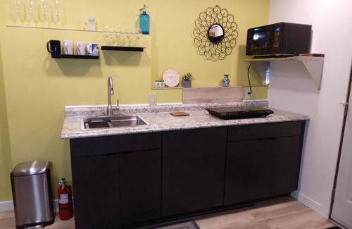 Nestled in Bend, this delightful house is the perfect retreat for guests seeking a pleasant and quaint vacation or a remote work experience. This ranch house is split into 2 flats, with separate entrances. The rental half is a approximately 950 feet, is completely separate and encompasses the entire 1st level. It includes 2 bedrooms with Queen bed in each, plus a furnished office. The flat has a well-equipped bathroom featuring a shower, double sinks and WC. Bath towels, extra linens, blankets and comforters, are inclusive and offer all the comforts of home. The living room/den space is mid-century modern, it has a beautiful bolstered sofa to provide a relaxing area to unwind. A 3 person dining area and a fully equipped kitchen provides microwave, air fryer and oven, and induction stove, refrigerator freezer, with big sink and closet pantry. This kitchenette is equipped for long stays so cooking is a breeze with all of these amenities. Stay connected with WiFi, and enjoy the convenience of the amenities like the inside garage parking, outside fire pit with teak furniture, central heat and air. Please also find some of the other small conveniences that we hope will make your stay more comfortable e.g. blow dryer, an iron and ironing board, and cozy bathrobes. Of note, every window in the house has pleasant views. We hope you plan to escape to our awesome guest house and immerse yourself in the charm of Bend.