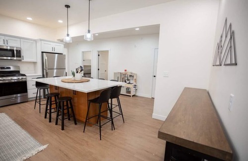 The property features three elegant bedrooms with king beds, one room with four twin beds, and ample parking space for trailers and larger vehicles. Two of the bedrooms offer attached bathrooms for added convenience. You'll love the modern decor throughout, along with a fantastic patio equipped with a propane firepit and grill—perfect for evening celebrations or casual gatherings. Enjoy complimentary Disney+, fast Wi-Fi, and private laundry facilities to make your stay even more comfortable. The easy self check-in process adds to the convenience, ensuring a stress-free start to your wedding festivities.