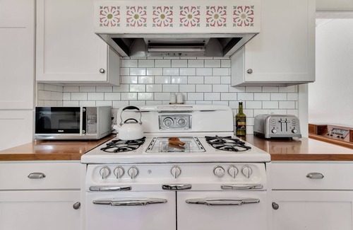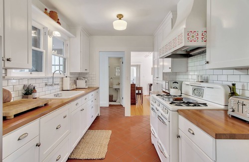 This home features a beautiful living space with plenty of room for gathering. Fully-stocked kitchen complete with a stylish vintage range, Keurig coffee maker, capsule espresso maker, drip coffee maker, French Press, coffee grinder, blender, toaster, hand mixer, tea kettle, crockpot, and microwave. The living room includes smart tv, couch and two lounge chairs. There is a separate dining room with large spanish style dining table with seating for 8. Each bedroom has a king-size bed. There is a full laundry room with washer and dryer.The back door leads to the covered patio in a garden setting with Hot tub, a dining table for 4 and a gas BBQ grill. Everything you need for a perfect wine country getaway and just steps away from the downtown restaurants and wineries!