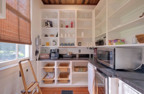 KITCHEN: Fridge, island w/ stove, double oven, dishwasher, microwave, cooking basics, coffee maker, walk-in pantry w/ wine fridge & coffee bar, dishware/flatware, paper towels/trash bags