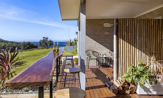Glass sliding doors lead out to a shared covered deck where whales are often observed while you sit at the outdoor furnishings enjoying a beveridge. Guests also have use of a shared outdoor Balinese inspired spa tub, with a quite outdoor seated area, a BBQ and outdoor shower. There is also a shared laundry with front loader washing machine, dryer, laundry sink and an extra toilet with an outdoor clothes line to the side of the apartment.