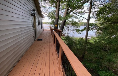Two separate large family rooms to relax (one upstairs and one in lower walk-out). BRAND NEW wood plank floors in upstairs family room. Huge decks with lots of BRAND NEW outdoor dining table, chairs and lounge chairs to enjoy the gorgeous lake view! Plenty of room inside and out for a family vacation. Activities galore - kayaks, canoe, fishing, cornhole game, firepit, swim rafts are all included. Come enjoy all the classic Michigan "Up North" experiences at this beautiful lake front home. Bring your own boat or rent ours - Pontoon boat available separately to rent. Grocery stores, restaurants, ATV trails, hiking and mountain biking trails and many golf courses nearby. Tawas and Lake Huron only 30 minutes away. Fully stocked kitchen with everything you need plus large gas grill. Located on a huge sprawling lot for privacy and room to spread out on family friendly AuSable Lake!