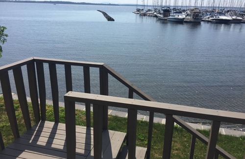 The deck overlooks the the lake with views of the Vermont mountains and Lake Champlain. There are views of the marina close by. Enjoy sitting out on the deck and watching the boats as they come and go. Walk 5 steps down the stairs and you're in the water. The water in the front of the house is clear and clean with a small rock and sand bottom. Water shoes are recommended.