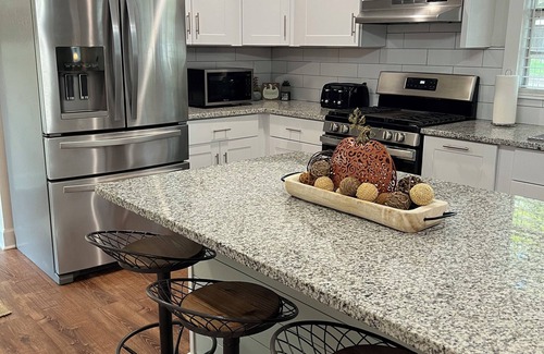 This house features 2 queen bedrooms with 2 full bathrooms (Bedroom 1 ensuite). The kitchen is fully equipped and has kitchen island seating as well as a dining table. Bring your own food to cook out on the grill and enjoy the wonderful, large patio. The bathrooms should have everything you need: towels, soaps, essentials and hair dryer.