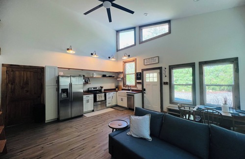 This 600 sq foot 1BR/1BR apartment was newly constructed in 2024. The 16+ foot tall ceilings, numerous windows and spacious loft add openness and space to the living area. The master bedroom has a comfortable queen-sized bed with mattress topper, spacious armoire and designated workspace complete with desk and office chair. The couch in the living room easily converts to another queen sized bed for extra guests. The living room has a Roku TV for streaming your favorite shows as well as a DVD player for movie nights. Board/card games and puzzles are provided for your entertainment. In the loft space above, you will find a twin sized futon and additional TV. This loft space can be used for storage or as another extra living space. All linens are provided. Our spacious bathroom boasts plenty of storage shelving, a full sized laundry unit and a tub/shower. The full sized, well-equipped kitchen is ready for you to cook your meals and is complete with a full-sized fridge and oven and a drip coffee maker and electric water kettle with provided coffee and tea. Outside you will find a shared patio space with adirondack chairs with a fire pit overlooking the farm and Smoky Mountains views.