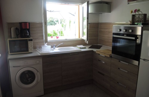 the kitchen with washing machine, coffee maker, oven, induction hob ...