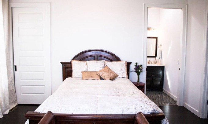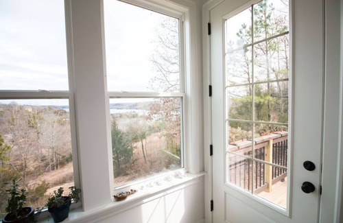 Natural light bathes this spacious lakeview suite. Enjoy the lake view from your bed, or take a walk on our secluded road. Enjoy deer, fox, birds. Includes a private sunroom, private bath, walk-in closet and private entrance to yard. We built our three-story house on top of a hill on top of a bluff. So, we are on eye level with the birds, and often looking down on them. We affectionately call this our nest.