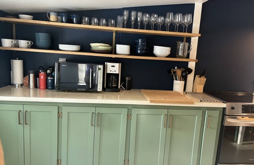 The kitchen is fully equipped with all the basics: refrigerator and freezer, oven, stove, toaster, drip coffee machine, water kettle, blender, pots and pans, cooking and eating utensils. There is a gas grill on the deck for your use in the warmer months.