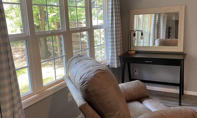 The Cottage has a view of Coon Lake from the living room window and is in close walking distance to a public dock where you can take off in your kayak, canoe, or paddle board. The amazing covered deck on the front of the house adds a charming grilling, eating and relaxing space. It leads into a large fenced inbackyard that has a fire pit with more seating to enjoy peace and quiet with only the birds to keep you company!