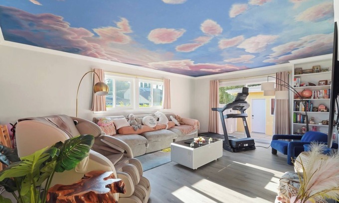 Feel like you're floating on clouds beneath the hand-painted sky mural. Cozy up on the plush sectional, unwind in the luxury massage chair, or enjoy a cinematic experience on the massive 75” smart TV.