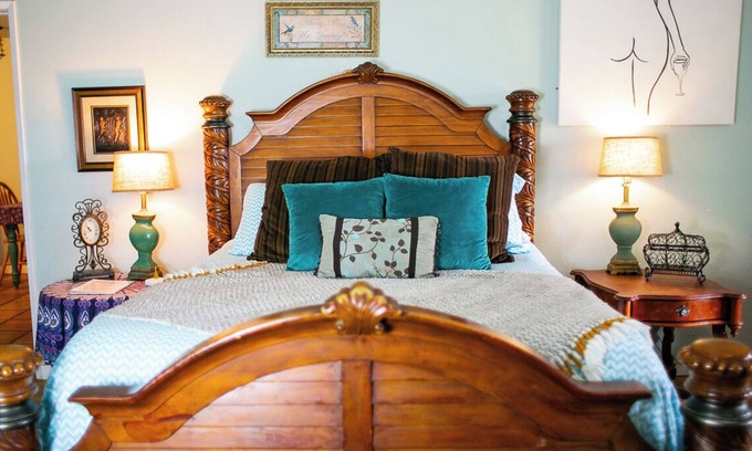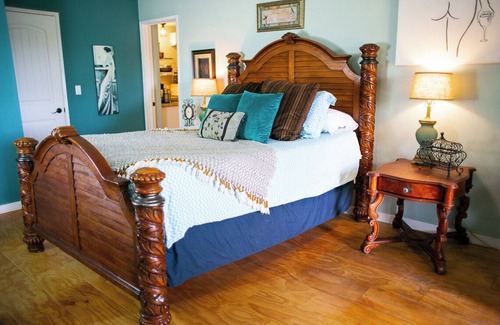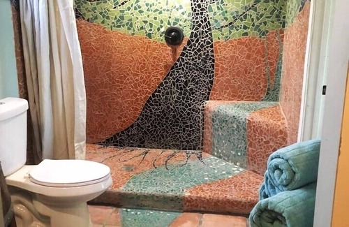 Tucked in the hills of San Diego, our organic subtropical farm is a great centrally located getaway destination. The beautiful 3-room space occupies the first floor of the original two-story, three-unit farmhouse on our family farm and has its own garden entrance with no shared spaces. Relax in the two-person hot tub and enjoy the quiet! We have five other farmstay homes here if this one is booked, or you'd like to reserve for a larger party. Whimsical is a spacious, one bedroom apartment; separate entrance with no shared spaces. Completely private. Lots of original art adorns the walls of this beautiful farm unit. Our largest one bedroom, it's spacious enough to spread out and work. The entire bathroom is a unique mosaic piece you walk into. Enjoy your coffee in the front garden while tossing treats to our peacocks when they visit. A rare fruiting mulberry tree greets you at the entry to your private get-a-way on the first floor of the original, three-family farmhouse. Working fireplace, we provide an eco-log for your first night. Decent wifi. We require a signed rental agreement signed within three hours of booking.