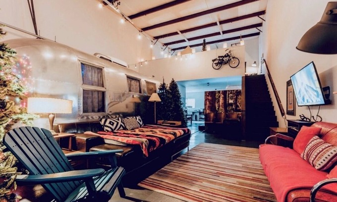 Welcome to “Land of Encampment”, a fun indoor glamping haven just half a block from Meow Wolf's House of Eternal Return! Stay in a beautifully restored Airstream Safari Camper with a cozy double bed + a spacious canvas glamping tent in the loft with a queen-size bed. There’s also a comfy daybed in the living room.
