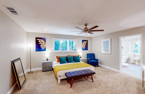 Gorgeously appointed, the two primary bedrooms offer fabulous perks like work desks and dazzling en suite bathrooms complete with soaking tubs. Bohemian fixtures and inviting color palettes fill each room, ensuring everyone's rest and comfort. When additional sleeping arrangements are needed, there is an air mattress available. Central air-conditioning and a private washer/dryer tie together the interior conveniences.