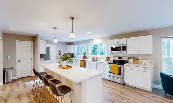 Boasting 3,300 sq ft of living, the interior of Peaceful Pines is composed of carefully curated antiques and designer furnishings. Sit under the high ceilings in the living room and engage in some playful competition over a board game. Steps from here, the chef's kitchen features a full suite of stainless steel appliances, marble countertops, and a sizable breakfast bar. When you aren't dining around the formal dining table inside, eat alfresco amidst the sounds of nature.