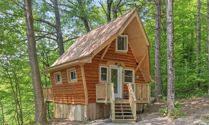 Step into a fairytale at this brand new handcrafted, one-of-a-kind cabin nestled in the trees of Vermont's Green Mountains. Featuring live-edge siding, a handcrafted spiral staircase of forest vines, Vermont slate bathroom with dual showers, and a view-filled deck suspended in the hardwood canopy. Cozy up by the propane fireplace or enjoy shared access to a riverside hot tub, firepit, and more. Located at Uncommon Accommodations in Johnson, Vermont