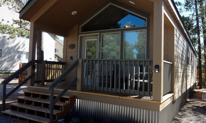 This cabin and all furnishings are new as of June 2014. Central AC installed September 2024. The rear bedroom has a king size bed and a 32" flat screen TV, the second bedroom has a queen size bed. The bathroom is situated between the 2 bedrooms and has ample storage, a tub/shower combo and also houses the stacked full size washer and dryer. The living room and kitchen are an open concept design. It has full size appliances in the kitchen, including a dishwasher and a 40" led flat screen TV with dish tv service. The sofa has a pull out queen size bed and the upholstered storage ottoman also doubles as extra seating. The kitchen is fully stocked with all the dishes, glassware, pots, pans, coffee maker, toaster and other items you would find in most kitchens as well as some basic cooking staples. Bed linens, towels, paper products, dish soap, laundry soaps and cleaning products are all supplied.