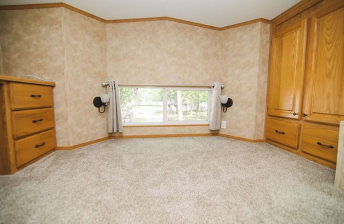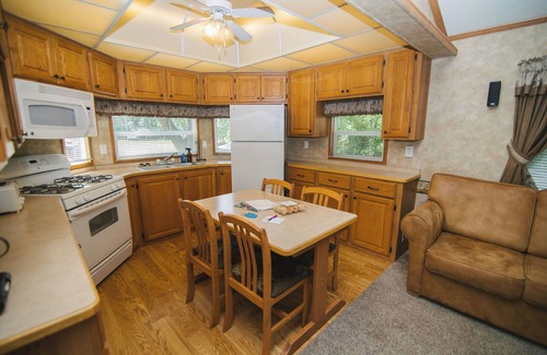 Whispering Pines is an ultra deluxe park model. This seasonal cabin is beautifully decorated and features a queen-size bed in a unique sunken master bedroom. It also has a loft for extra sleeping arrangements, which is perfect for a couple of extra guests. In addition to a generous kitchen and living room area, it has a spacious sundeck located just steps from the lake! Book this lake cabin today for a great Minnesota vacation!