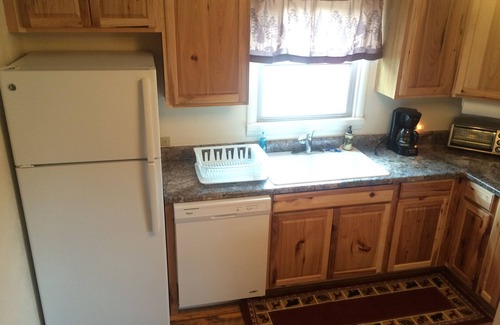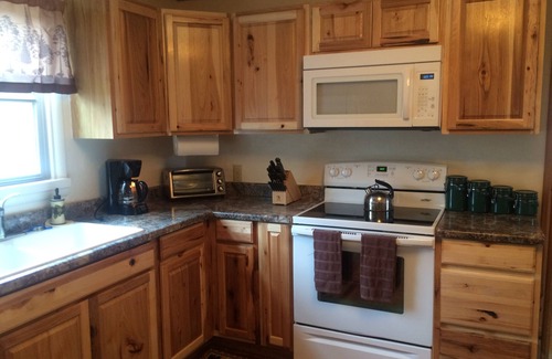 Whispering Pines is nestled among pines situated on a hill on a private two acre lot. The deck is an amazing place to grill on the gas barbecue , gaze at the stars and watch the snow fall in the hot tub, or just relax and enjoy the view. The living room has rustic charm and features a gas fireplace to keep you warm and cozy. The large windows frame the scenery beautifully leaving you feeling as though you're still outdoors in the comfort of the indoors.