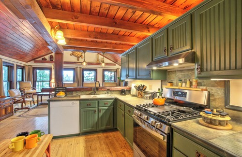 There is a private beach and boat dock with 2 canoes, 2 kayaks & 2 SUP’s for your use. It is a 1940’s themed cabin, 100 year old wood flooring throughout, modern furniture, new appliances, full-size bathroom & new stacked/washer dryer. We have fast fiber optic internet & Roku TV. Strict NO PET POLICY!