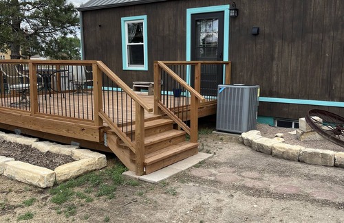 A newly renovated home with a rustic elegant theme. Sits on 5 acres in the small unincorporated town of Pfeifer Kansas. Private bedroom with queen bed, loft with full size and twin bed. Sleeper sofa in living room. Complete kitchen with cooking essentials. Washer and dryer, central heat and air conditioning. Water treatment system. Full bathroom with custom built shower. High speed wireless internet. 32” TV. Full size deck with furniture and charcoal grill. Fenced in back yard for drywall gs. Pet friendly! Lots of area to walk and explore around town.