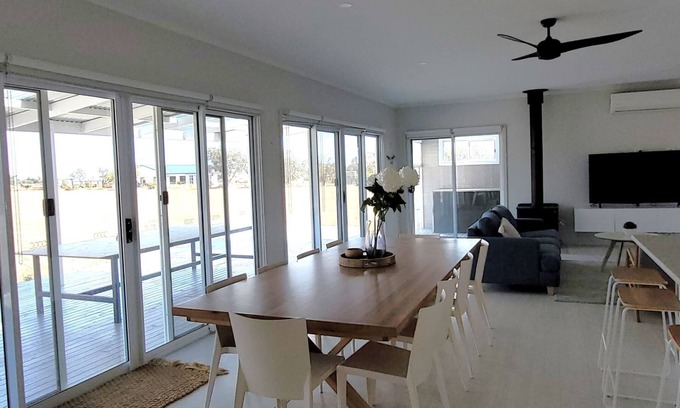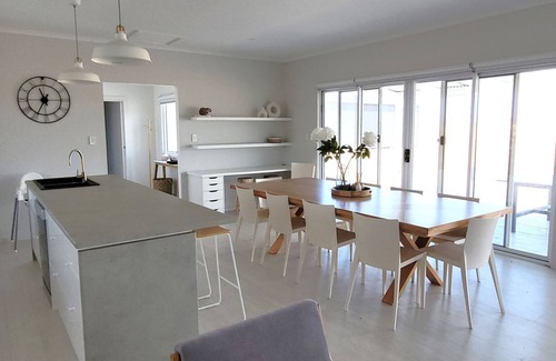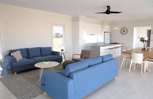 PROPERTY DETAILS: 4 bedrooms - king, queen, bunk & queen, 2 singles. Sleeps 10; Quilts and pillows provided – BYO sheets, pillowcases, towels, bathmats & tea-towels OR optional linen hire $170 available through Country Getaways office; optional linen service fee $80 for beds to be made up. Ensuite bathroom with walk-in shower, vanity & toilet; Main bathroom with bath, walk-in shower & vanity; Separate toilet. Reverse cycle split-system air-conditioning in lounge room; Ceiling fans in all bedrooms; Living area has ceiling fan; Wood combustion heater in lounge room (guests need to bring wood to use). Large open plan living area; Large television (with USB & HDMI ports) in lounge room; BluRay player; WiFi for guest use; Radio. Wall-mounted television in master bedroom. Board games including Monopoly & Scrabble; Card games including Uno. Fully equipped kitchen with electric stove, microwave, dishwasher, coffee machine (guests need to bring compatible Nespresso pods or purchase locally), & large fridge with freezer on top; High chair. Top load washing machine. Outdoor entertaining area with kitchen facilities; Seating & dining on undercover deck; Hooded gas barbecue; Bar fridge in outdoor kitchen. Unfenced yard. Fish cleaning sink. 15 minutes’ walk to beach. Off-street parking for 3 cars with room for a boat; No guest access to garage. Pets by arrangement only ($100 refundable bond applies per pet) - inside pets accepted.