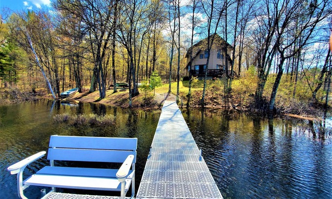 NEW: gas stove fireplace, king log bed in master, new carpet, new mattresses & linens, dock bench & swim ladder, stand up paddleboard, 2nd canoe, 2 kayaks, gas grill
