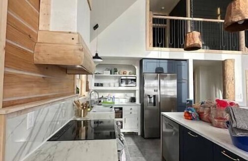 -Modern kitchen, outdoor lounging space and laundry amenities mean you can have all your needs met as you take in the views and hide away at this special place with loved ones. -The on-demand water heater makes it so everyone can use the amenities and bathrooms without running out of hot water. -The owner is an artist and you’ll find fun artistic surprises throughout the home from the tree trunk stairway to the wagon wheel window.