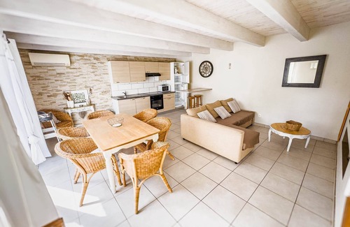 Duplex of 75 m2 for 1 to 4 people including: living room with sofa bed, integrated TV and DVD, fully equipped kitchen, bathroom with sink, shower and toilet, bedroom with a 160cm2 bed, bedroom with bunk bed and bed additional. Air conditioning in each room. Private terrace with parasol, table and garden furniture, private entrance. The swimming pool, gym, sauna, laundry room and petanque area are available to guests in all 5 gîtes. Air conditioning in every room, Wi-Fi, linen, towels and end-of-stay cleaning included.