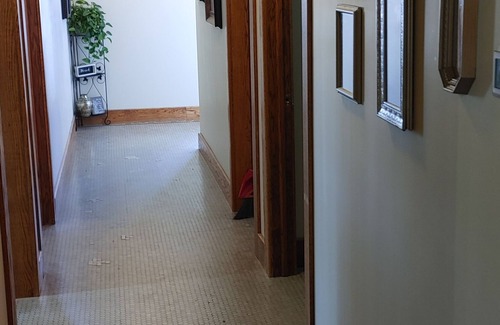 This is newest and largest unit we currently have available. The unit has 3 bedrooms for bigger groups. Lots of open common areas to gather in as well, big dining room and living room areas. Does have only a kitchenette currently. Laundry facilities are in place onsite as well. Beautiful tile shower and bathroom.