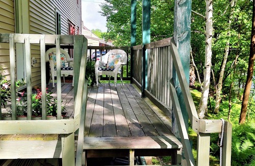 White Mountains Riverfront Studio is a private unit in our Victorian home built in 1902, located on Main Street in Gorham. A private porch with entrance welcomes guests. The private entrance serves as a mudroom with bench and coat racks. Head up the stairs to the studio. The studio living space is bright and airy and offers a comfy queen-size futon, dinette set, coffee table, and Roku TV. A well-equipped kitchenette and coffee/tea bar add a touch of practicality while maintaining studio coziness. The door just off the kitchenette steps out unto a large private deck. Enjoy the serene Androscoggin River from the wicker love seat and bistro set. The studio's large full bathroom has a walk-in closet, built-in ceiling-to-floor drawers and full length mirror.