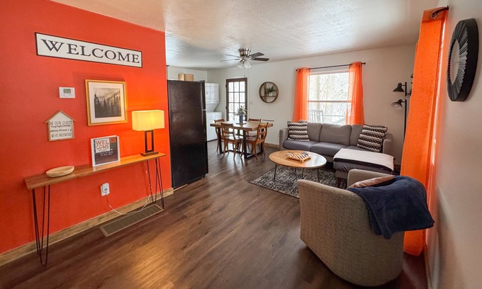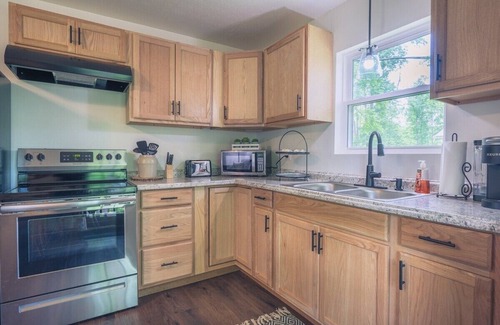 This completely remodeled cozy 2 bedroom hideaway is great for a romantic getaway for two or a family adventure. You will enjoy all the comforts of home with central heat/air and a fully stocked kitchen with all the pots, pans, dishes, and silverware you'll need for 4. The Kitchen features a full-sized electric range, refrigerator, microwave, and Keurig coffee maker. There is a 42” roku tv in the main living area. Hughesnet satellite internet for working remotely or streaming.