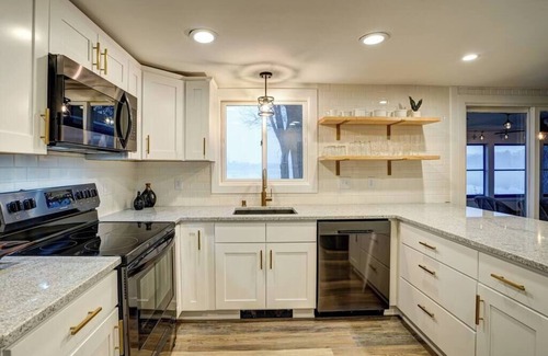 This fully remodeled 2 bedroom, 1 bath home boasts a 3-season screened in porch with fire table, a year-round hot-tub and fire pit (wood provided). As well as a gas grill (propane provided) and a kitchen fully stocked with all the basic cooking essentials. The main bedroom has a queen bed and the second bedroom has a full bed and a twin bed.