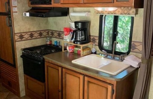 When you turn off of the main road, you will come up our driveway. Our home is to the left, and if you follow the driveway up and to the right it will take you to the RV. There are two clearly visible parking spots right in front of the RV. At dusk, the rope lights come on in front of and around the RV to illuminate the seating area and the entry to the RV. The RV has full power and water hookup so you always have fresh water and electricity available. The RV boasts 1 queen bed, 2 twin bunks in the back, and the dinette folds down to sleep another 2 kids or 1 adult if needed. If you bring your furry friend with you I am fine with your dog sleeping in the RV as long as nothing is damaged:)