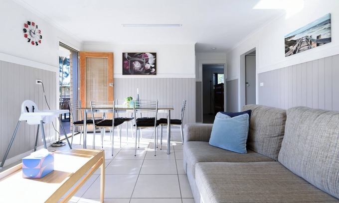 The living area flows into a practical kitchen with everything you need to cook at home. Outside, the deck is a good spot for a casual meal or drying your beach gear.