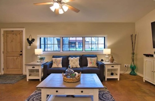 White Stag Guesthouse features over 1400 square feet of living space with 2 spacious bedrooms, a sleeper sofa in the living area, 1 bath, full kitchen, breakfast area, dining area, living area, stained concrete floors, flat screen TV and WiFi. There is a Pack-and Play for infants. It sits high above Mason, just down from historic Fort Mason. It is half a mile walk down the hill to the historic town square where there are several restaurants. Mason offers wine tasting on the square as well. Enjoy the views and the peaceful surroundings.