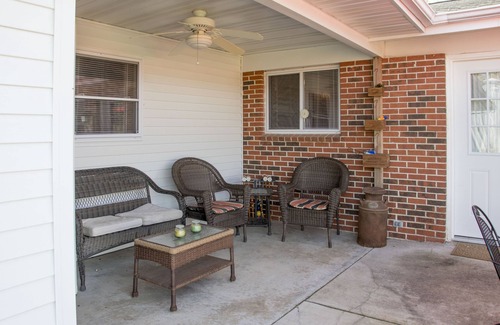 The apartment features one spacious bedroom with a luxurious king-sized bed, a well-appointed bath with a walk-in shower, and a versatile kitchen/living area with a queen sofa/sleeper—accommodating up to four guests comfortably. The entire space is designed to be handicap-friendly, making it accessible for all. Enjoy quality time outdoors on the shared patio equipped with a gas grill and fire pit, perfect for evening gatherings with family and friends after your wedding festivities.