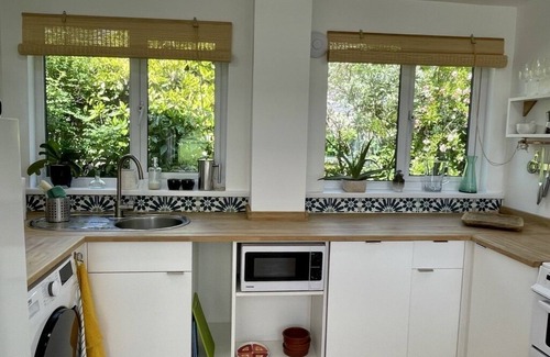 The spacious, thoughtfully designed kitchen is beautifully laid out. The kitchen has a generous worktop space, a dishwasher, a washer/dryer, and a full-sized fridge freezer. It is well equipped with an oven, grill, ceramic hob, fridge microwave, cafetière, hand blender and all the pots, pans, plates, bowls and cutlery you could need. Windows look out onto the bird-filled hedgerow behind. A selection of Exmoor Teas, locally roasted coffee, olive oil and basic condiments are provided.