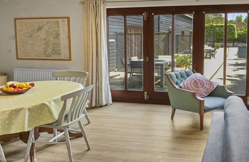 The ground floor is open plan to the lounge, dining area and kitchen with large sliding doors leading out to the shared external patio area. Within the sitting room is a large corner sofa bed, possibly accommodating an additional 2 guests, allowing the cottage to possibly sleep up to 4 guests in total.