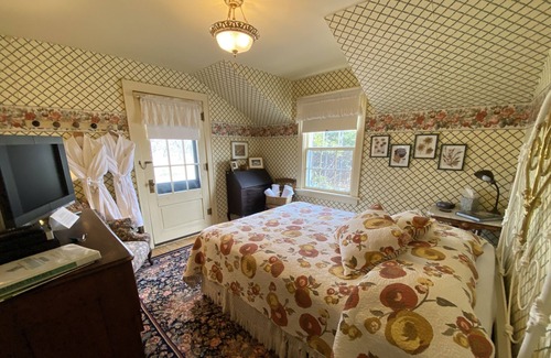 Elizabeth’s Loft is a sweetly, comfortably decorated room on second floor featuring photos of Elizabeth Garst's life and travels. Includes Queen bed, reading chair, desk and vanity, closet and TV. Shares a spacious bathroom with Toshiama Room.